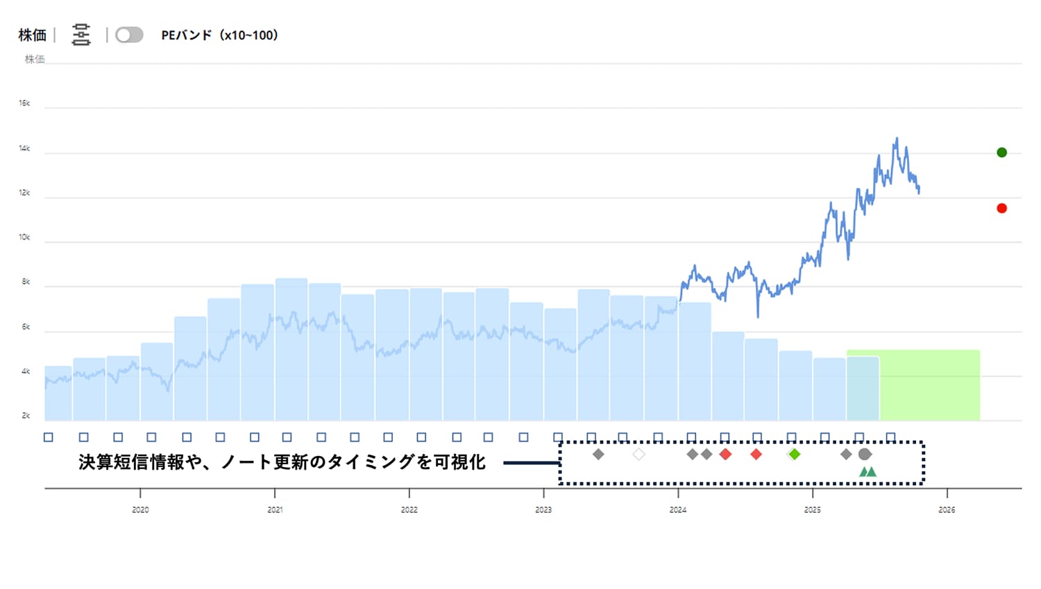 過去の売買・目標株価設定日をチャート上に自動記録し、関連する決算情報や市場価格の推移と重ねて表示します。